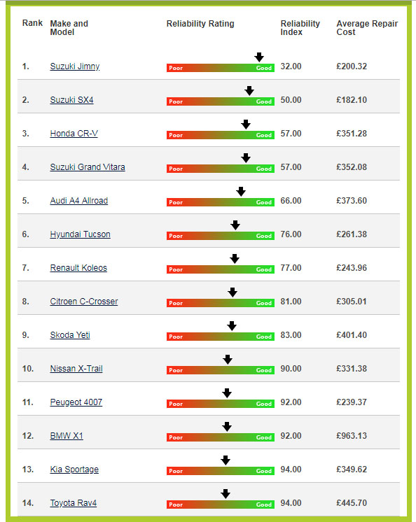 Ποια SUV όμως από όλα αυτά που πωλούνται τόσο στην αγορά των μεταχειρισμένων είναι τα πιο αξιόπιστα και εμφανίζουν τα χαμηλότερα ποσοστά εμφάνισης βλαβών; Μια αξιόπιστη απάντηση πάνω σε αυτό το ερώτημα δίνει η Βρετανική εταιρία Reliability Index μέσα από τη μεγάλη βάση δεδομένων που διαθέτει (πάνω από 50.000 οχήματα), η οποία συνεχώς ανανεώνεται.