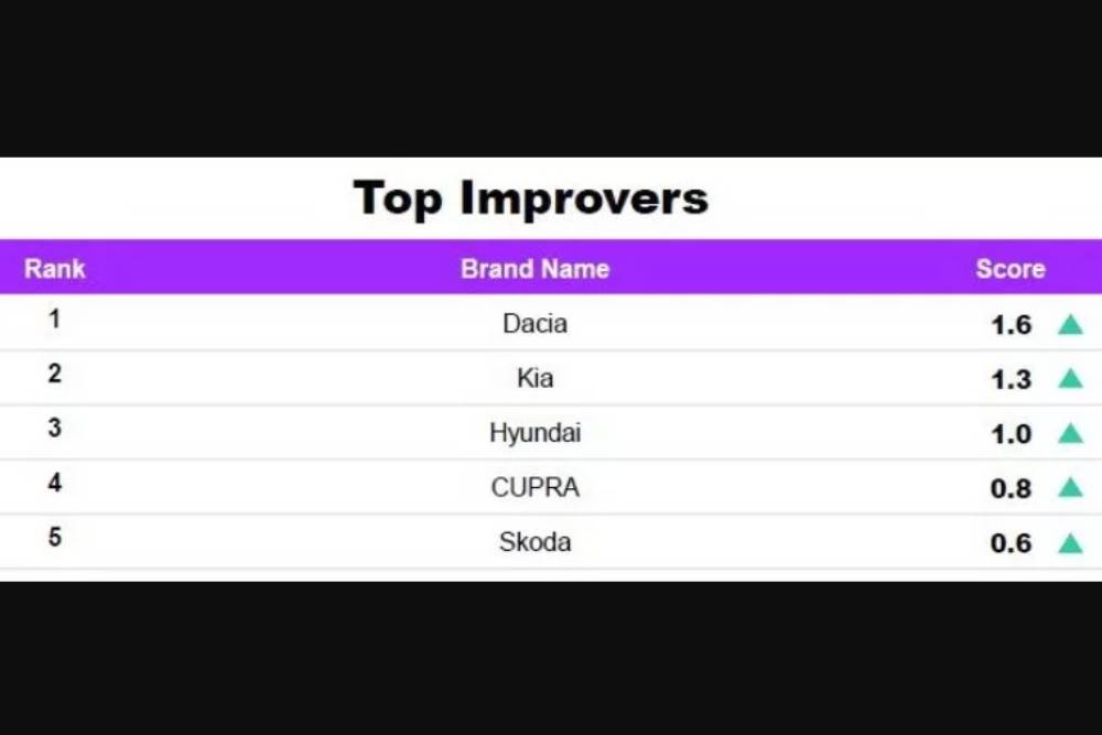 Η γαλλικών καταβολών Dacia είναι αυτή με τη μεγαλύτερη βελτίωση στο σκορ, ακολουθούμενη από το κορεατικό δίδυμο των Kia-Hyundai. Η Cupra κάνει την έκπληξη και τοποθετείται στην 4η θέση, οριακά μπροστά από τη Skoda.