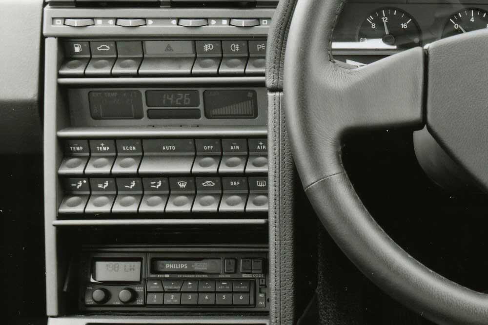 Επίσης, με τα προαναφερθέντα μοντέλα δεν είχε και καμία σχεδιαστική συγγένεια, τόσο εξωτερικά, όσο και στο εσωτερικό. Σε αυτό εντύπωση προκαλούσε το πολύ μικρό σε βάθος ταμπλό, αλλά κυρίως η γεμάτη κουμπιά κεντρική κονσόλα. Τα περισσότερα από αυτά αφορούσαν τις ρυθμίσεις του αυτόματου κλιματισμού, τα οποία ήταν 15 (!), συν άλλα 7 στο ανώτερο τμήμα για τα αλάρμ, άνοιγμα του πίσω καπό και τάπας βενζίνης, τα φώτα ομίχλης κ.λπ. Μαζί και με τα κουμπιά του ραδιοκασετόφωνου, ήταν μια κονσόλα γεμάτη από διακόπτες ίδιου μεγέθους και σχήματος. Αντιθέτως, στις πιο απλές εκδόσεις υπήρχαν πολύ λίγα χειριστήρια για το air condition, όμως το ταμπλό έδειχνε πολύ φτωχό.