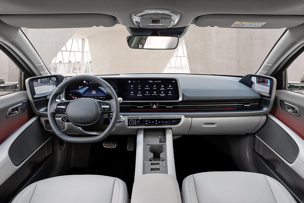 Στα highlights του Ioniq 6 ανήκουν και οι κάμερες στη θέση των παραδοσιακών εξωτερικών καθρεπτών. Η εικόνα μεταφέρεται στις δύο οθόνες που βρίσκονται στις άκρες του ταμπλό και παρέχουν απρόσκοπτη ορατότητα προς τα πίσω. Την ψηφιακότητα ενισχύουν με την σειρά τους οι δύο οθόνες των 12,3 ιντσών, μία για τον πίνακα οργάνων και μία για το infotainment. Το εσωτερικό του εντυπωσιάζει και σε χώρους για τους επιβάτες, γεγονός που οφείλεται και στο μακρύ μεταξόνιο των 2.950 χιλιοστών, σε συνδυασμό με το εντελώς επίπεδο δάπεδο. Για τις αποσκευές υπάρχουν 401 λίτρα, μαζί με άλλα 45 λίτρα κάτω από το εμπρός καπό ή 14,5 λίτρα στα τετρακίνητα Ioniq 6.