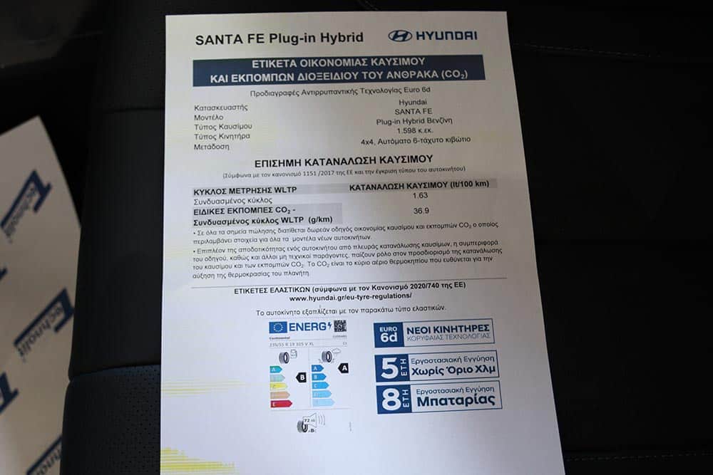 Η μετάδοση σε όλους τους τροχούς γίνεται μέσω ενός αυτόματου κιβωτίου 6 ταχυτήτων. Το Santa Fe 1.6 T-GDi PHEV των σχεδόν 2 τόνων βάρους επιταχύνει από 0-100 χλμ./ώρα σε 8,8 δλ., με μέγιστη ταχύτητα 187 χλμ./ώρα, μεικτή κατανάλωση 1,6 λτ./100 χλμ. και εκπομπές CO2 37 γρ./χλμ.