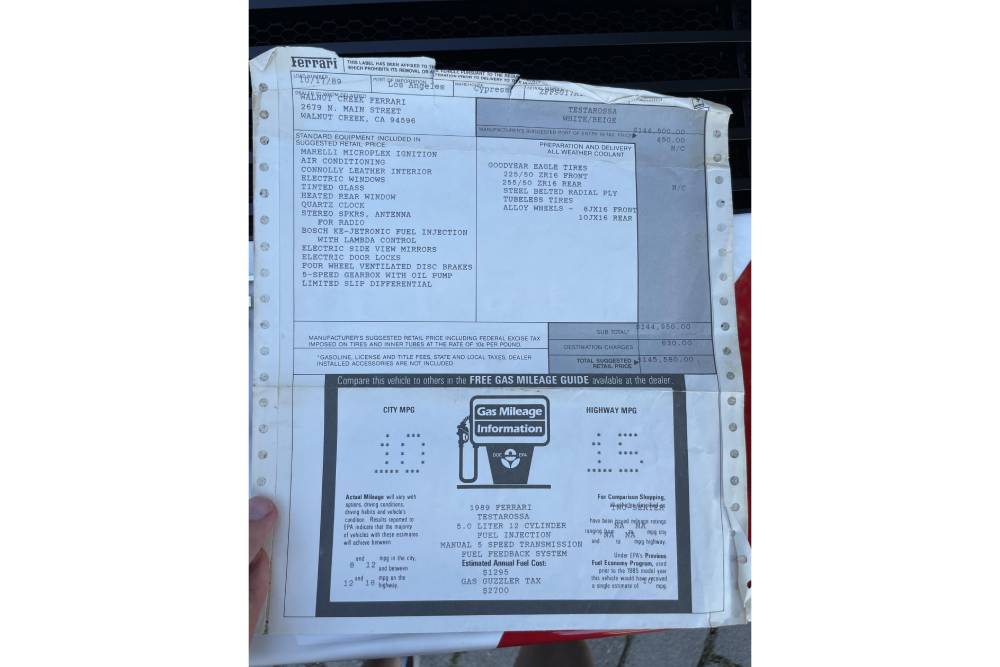 Κατά τα λοιπά, το αυτοκίνητο παραμένει απολύτως εργοστασιακό. Ο 12κύλινδρος boxer των 4.943 κ.εκ. και 48 βαλβίδων αποδίδει 390 ίππους στις 6.300 σ.α.λ. και 490 Nm στις 4.500 σ.α.λ., αριθμοί που έχρισαν την Testarossa ως την μέχρι τότε ισχυρότερη Ferrari όλων των εποχών, το 1982 που παρουσιάστηκε. Τα 100 χλμ./ώρα από στάση έρχονταν σε 5,4 δλ., τα 160 χλμ./ώρα σε 11,4 και το 400άρι σε 13,5 δλ., ενώ η τελική έφτανε στα 290 χλμ./ώρα. Η συγκεκριμένη είναι ελαφρώς μεταγενέστερη, του 1989, και μέχρι σήμερα δεν έχει καταγράψει ούτε 10.000 χλμ. Η τιμή της, με 5 μέρες να απομένουν για την ολοκλήρωση της δημοπρασίας, διαμορφώνεται στις 60.500 δολάρια (50.700 ευρώ).