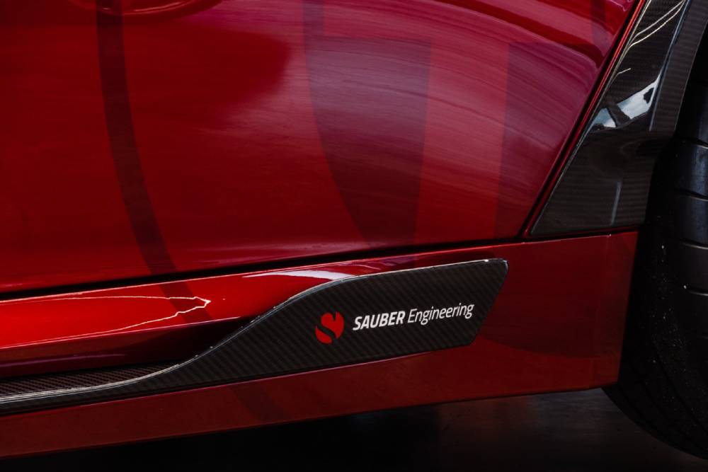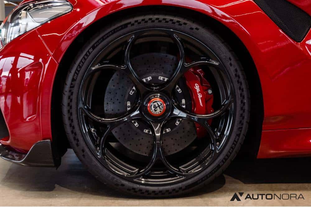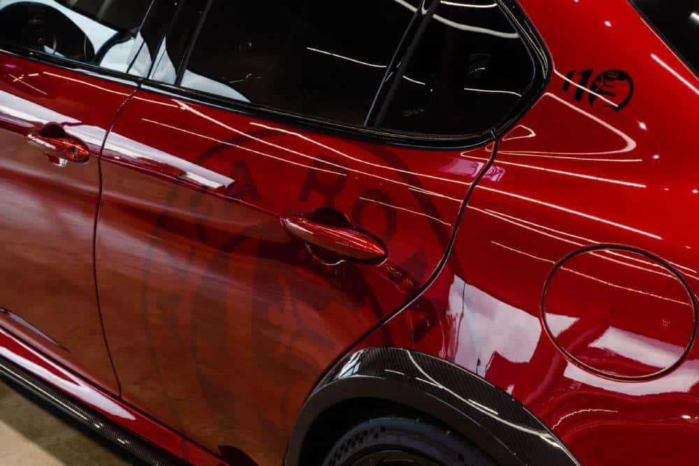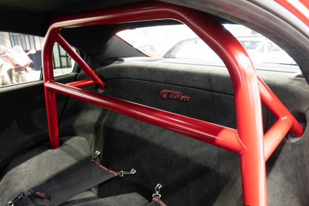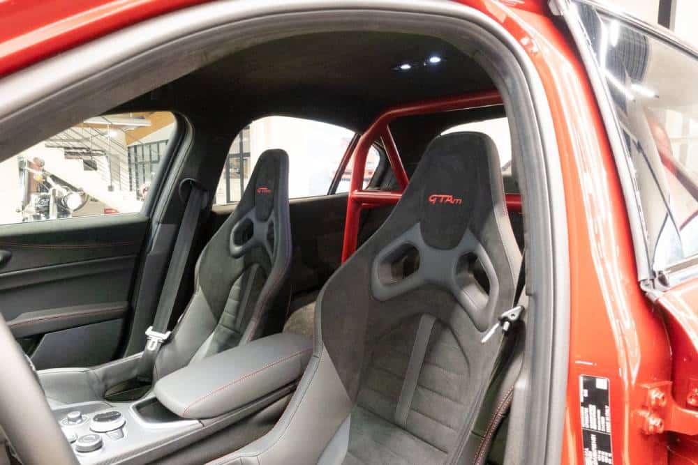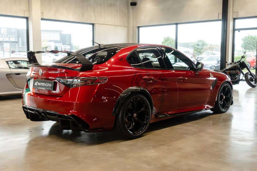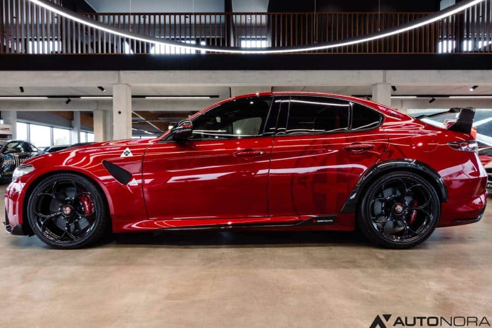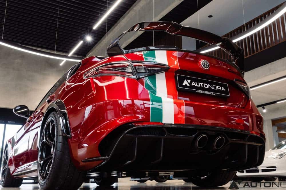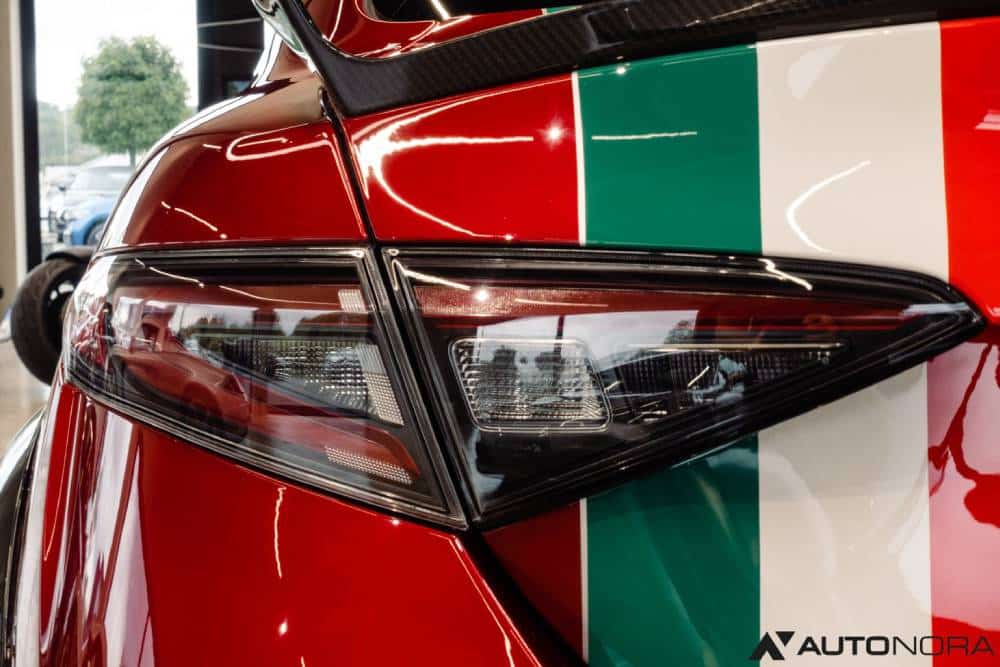 Πράσινο, λευκό και κόκκινο διατρέχουν από άκρη σε άκρη την αριστερή πλευρά, που εντελώς «συμπτωματικά» είναι αυτή του οδηγού. Ένας χρωματισμός που θυμίζει πολύ τις αντίστοιχες τρίχρωμες λωρίδες των Ferrari, οι οποίες κοστίζουν δεκάδες χιλιάδες ευρώ για να μπουν στις εκάστοτε 360, 430 και 458 παλιότερα, F8, 812 SF και SF90 (γιατί όχι και Purosangue) σήμερα. Οι μαύρες 20άρες ζάντες (σε ελαστικά 265/30 εμπρός και 285/30 πίσω) μαζί με το βαθύ κόκκινο χρώμα του αμαξώματος, συνεχίζουν κανονικά και αισθησιακά από την εργοστασιακή περιβολή της Giulia GTAm.