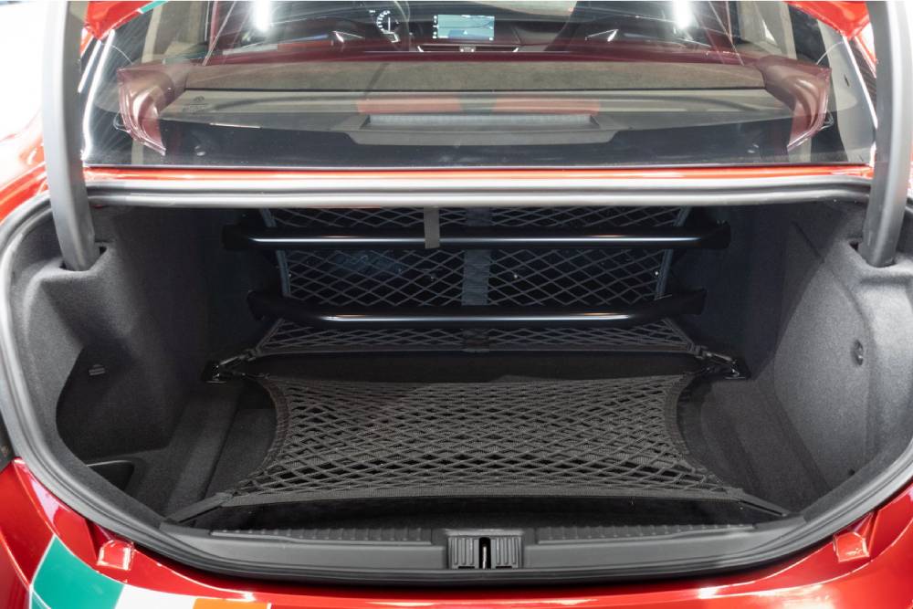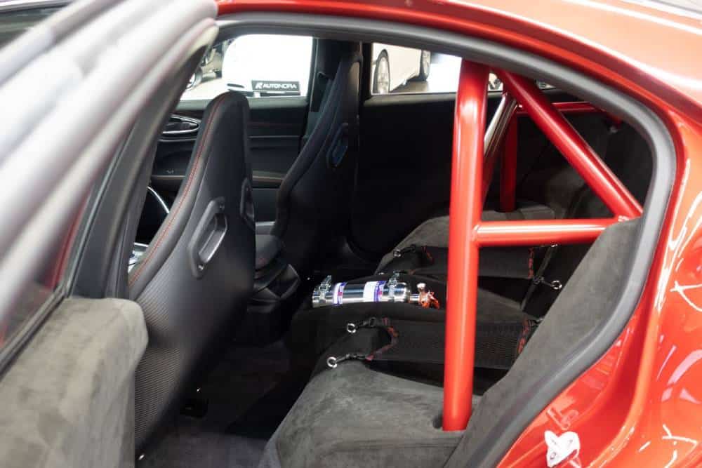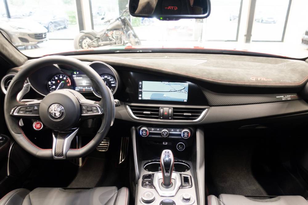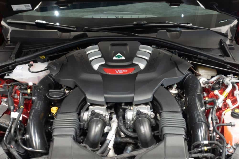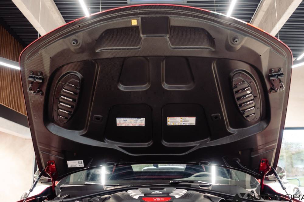 To ίδιο ισχύει για το περιβάλλον κάτω από το ανθρακονημάτινο καπό, όπου συναντάμε τον -καταγωγής Μαρανέλο, όπως είπαμε- 2.9 V6 twinturbo σε απόδοση 540 ίππων στις 6.500 σ.α.λ. και 600 Nm στις 2.500 σ.α.λ. Η εκτενής χρήση carbon και η αφαίρεση των πίσω καθισμάτων (roll cage στη θέση τους) επιφέρει μείωση του βάρους κατά 100 κιλά σε σχέση με την απλή Giulia QV (1.520 στο σύνολο), διαμορφώνοντας την ειδική σχέση ζυγαριάς-ιπποδύναμης στα 2,81 κιλά ανά ίππο. Αριθμοί που οδηγούν σε 0-100 χλμ./ώρα της τάξης των 3,8 δλ. και μια τελική 290 χλμ./ώρα, η οποία θα ήταν πολύ πάνω από 300 χλμ./ώρα αν το αεροδυναμικό πακέτο δεν έδινε έμφαση στην παραγωγή κάθετης δύναμης.