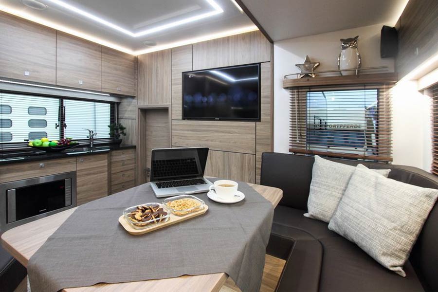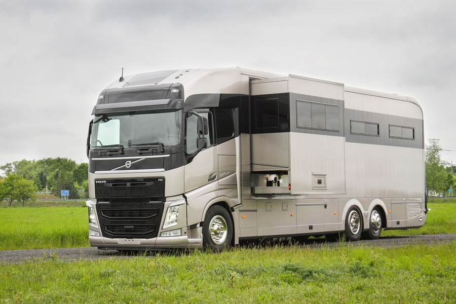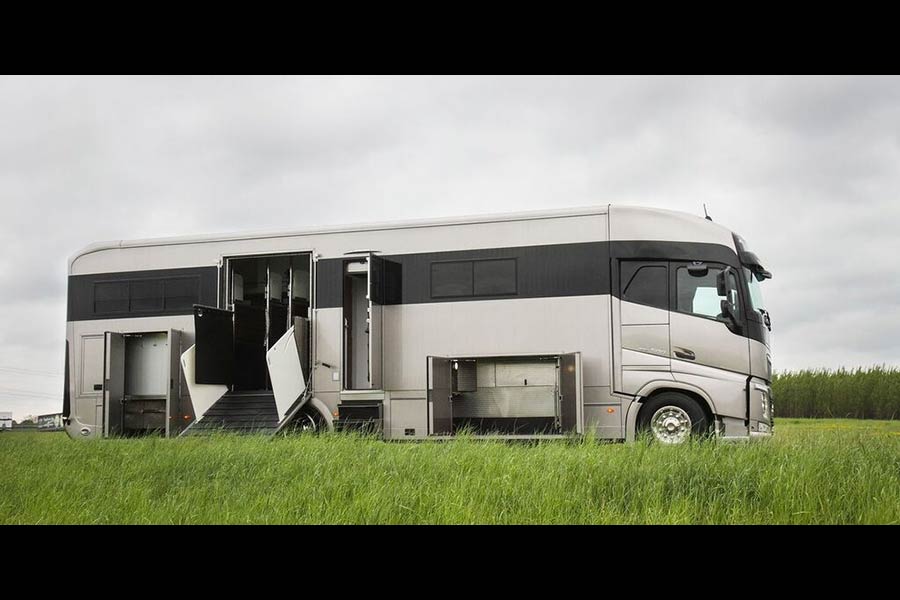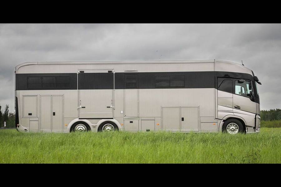 Βλέποντας κανείς εξωτερικά το εικονιζόμενο Volvo, νομίζει ότι είναι ένα από αυτά τα υπερπολυτελή αυτοκινούμενα τροχόσπιτα, τα οποία αξίζουν εκατοντάδες χιλιάδες ευρώ και προσφέρουν άφθονη πολυτέλεια στο εσωτερικό τους. Τα περισσότερα προαναφερθέντα χαρακτηριστικά ισχύουν, μόνο που το συγκεκριμένο όχημα, εκτός από επιβάτες μεταφέρει και άλογα με την υπέρτατη χλιδή.