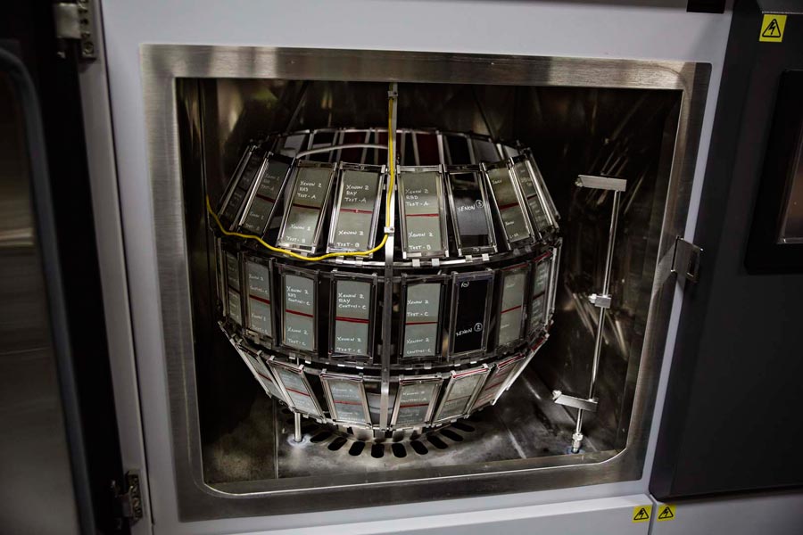 Για να αξιολογήσει τις επιπτώσεις της ηλιακής ενέργειας στη βαφή και σε άλλα υλικά, ένας λαμπτήρας Xenon των 4.000 Watt, σχεδόν ψήνει 100 δείγματα, στα ίδια μήκη κύματος με τον ήλιο. Τα δείγματα περιστρέφονται γύρω από τη λάμπα Xenon για να μιμηθούν την τροχιά της γης και καθώς ο εργαστηριακός «ήλιος» μπορεί να «λάμψει» καθ’ όλο το 24ωρο, η διαδικασία απαιτεί το ήμισυ του χρόνου, για τη δοκιμή των δειγμάτων βαφής. Οι μηχανικοί παρατηρούν τα δείγματα του υλικού μέσω μιας σειράς κύκλων, για να ερευνήσουν τις αλλαγές και να εξασφαλίσουν κορυφαία ανθεκτικότητα και ποιότητα, για τους ιδιοκτήτες των μοντέλων της Nissan.