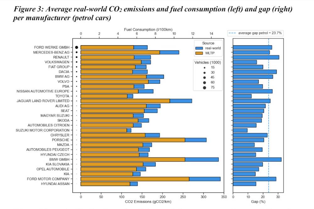 Τα πρώτα δεδομένα από ένα δείγμα 600.000 αυτοκινήτων δείχνουν ότι η πραγματική κατανάλωση καυσίμου και οι εκπομπές CO2 από οχήματα ντίζελ και βενζίνης στο δρόμο, είναι περίπου 20% υψηλότερες από τις εργοστασιακές ανακοινώσεις βάσει WLTP. Απόκλιση που συνάδει με τις προβλέψεις της Κομισιόν, όταν θεσπίζονταν οι όροι δοκιμών του πρωτοκόλλου World Harmonized Light-Duty Vehicles Test Procedure. Για τα plug-in υβριδικά οι πραγματικές εκπομπές CO2 ήταν κατά μέσο όρο 3,5 φορές υψηλότερες από τις εργαστηριακές τιμές, γεγονός που επιβεβαιώνει ότι αυτά τα οχήματα επί του παρόντος δεν αξιοποιούν τις δυνατότητές τους, κυρίως επειδή δεν φορτίζονται και δεν οδηγούνται πλήρως ηλεκτρικά. Κοινώς, οι κάτοχοί τους δεν ξέρουν πώς να τα χρησιμοποιούν.