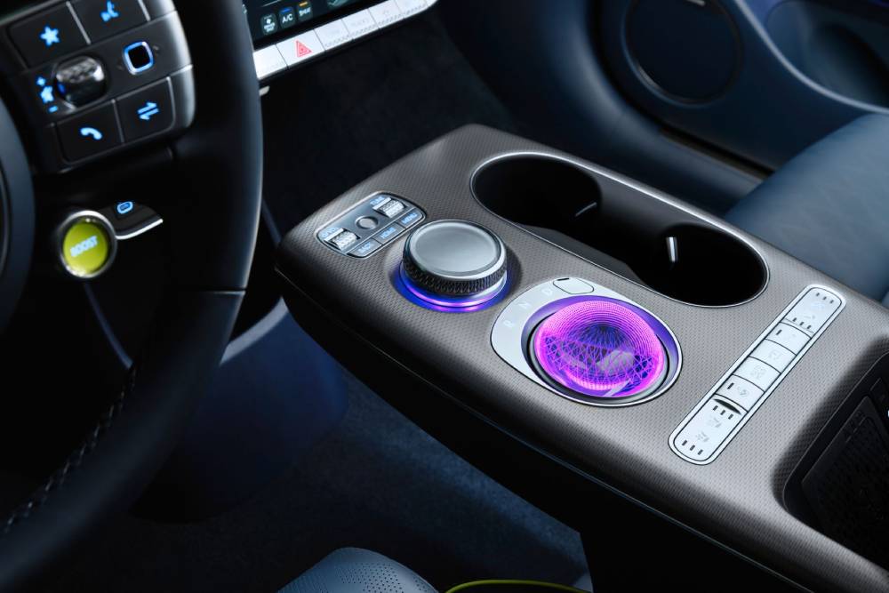 Εντός του αυτοκινήτου συναντάμε ενιαία διάταξη στις οθόνες για τον ψηφιακό πίνακα οργάνων και το σύστημα πολυμέσων, αμφότερα στις 12,3 ίντσες, με το βλέμμα να επικεντρώνεται στο μπλε χρώμα των δερμάτινων επενδύσεων και το τιμόνι των δυο ακτίνων. Τα δυο κουμπιά στο κάτω μέρος του ελέγχουν τα προγράμματα λειτουργίας (το αριστερό) και το overboost (αυτό με τη λεμονί απόχρωση), ενώ σχεδιαστικό highlight αποτελεί ο επιλογέας – γυάλινη σφαίρα (Crystal Sphere σύμφωνα με τους Κορεάτες), που περιστρέφεται! Κι όχι μόνο αυτό, αλλά φωτίζεται κιόλας.