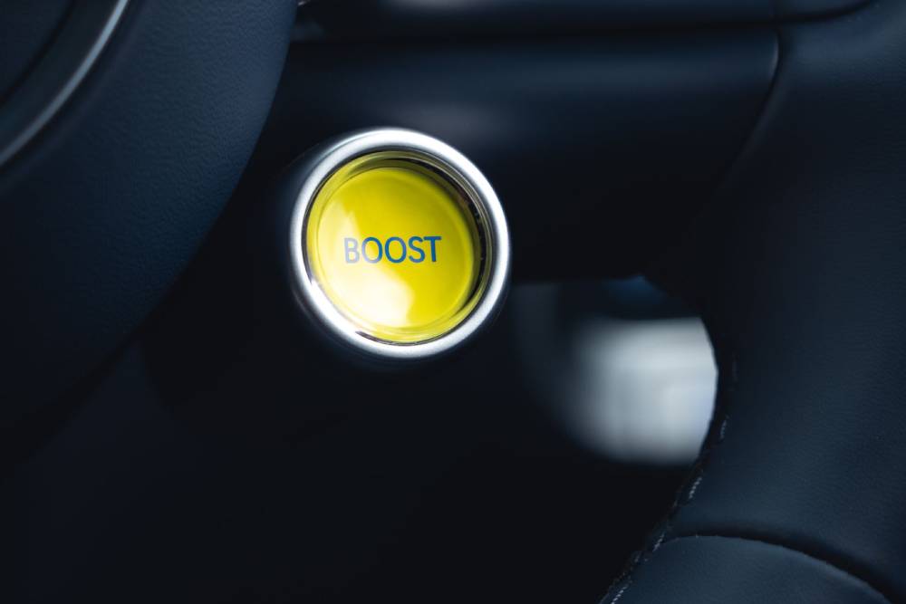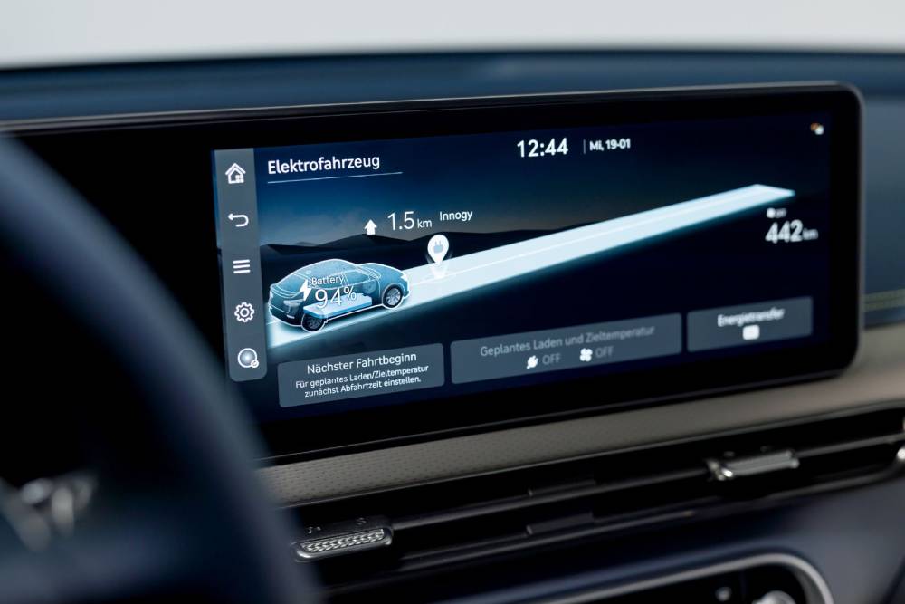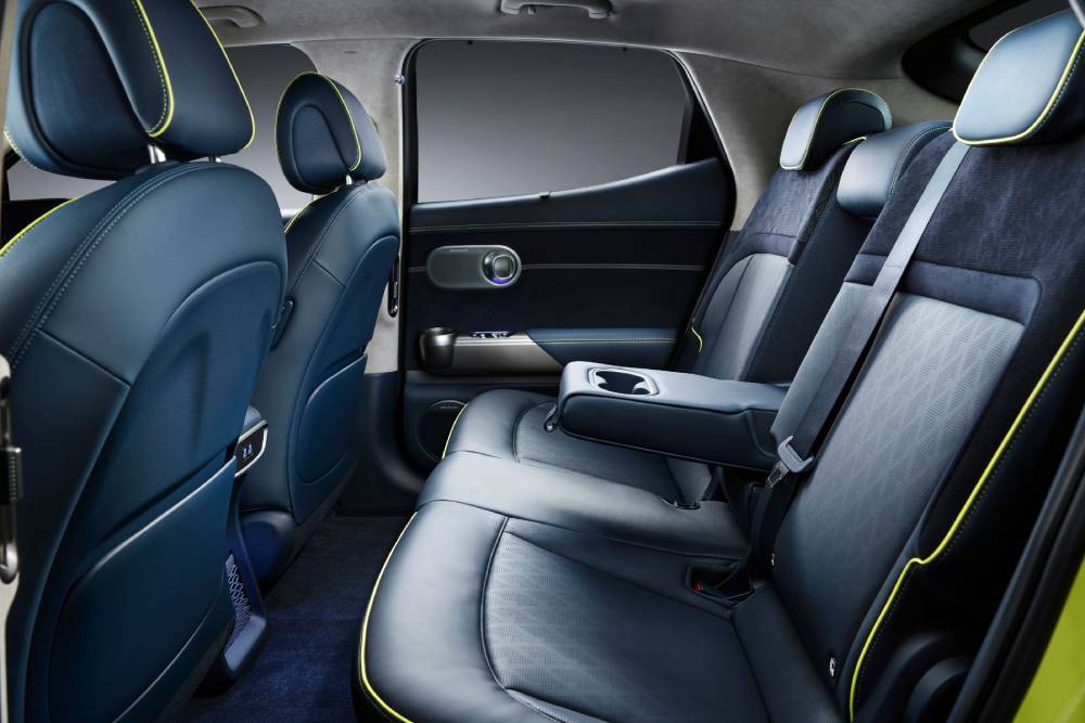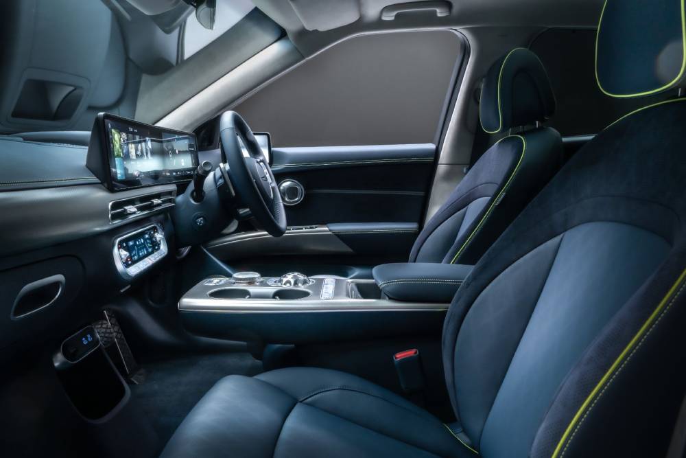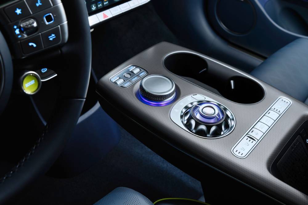 Εντός του αυτοκινήτου συναντάμε ενιαία διάταξη στις οθόνες για τον ψηφιακό πίνακα οργάνων και το σύστημα πολυμέσων, αμφότερα στις 12,3 ίντσες, με το βλέμμα να επικεντρώνεται στο μπλε χρώμα των δερμάτινων επενδύσεων και το τιμόνι των δυο ακτίνων. Τα δυο κουμπιά στο κάτω μέρος του ελέγχουν τα προγράμματα λειτουργίας (το αριστερό) και το overboost (αυτό με τη λεμονί απόχρωση), ενώ σχεδιαστικό highlight αποτελεί ο επιλογέας – γυάλινη σφαίρα (Crystal Sphere σύμφωνα με τους Κορεάτες), που περιστρέφεται! Κι όχι μόνο αυτό, αλλά φωτίζεται κιόλας.