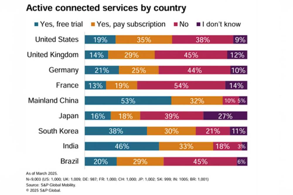 Κάτι που, βάσει έρευνας από την S&P Global Mobility, προκαλεί θυμηδία στο καταναλωτικό κοινό παγκοσμίως. Σύμφωνα με τα αποτελέσματα, στις περισσότερες αγορές του κόσμου οι αγοραστές δεν «ψήνονται» για μια σχέση με το αυτοκίνητό τους, ανάλογη με εκείνη των Netflix, Amazon Prime και λοιπών πλατφορμών ψυχαγωγίας. Από τις 9 χώρες που διενεργήθηκε η έρευνα, στις 7 το «δεν πληρώνω» είναι από λίγο ως πολύ μεγαλύτερο του «τα σκάω» για συνδρομητικές υπηρεσίες στο αυτοκίνητο. Στις Η.Π.Α. η κατάσταση είναι ισορροπημένη, με 35% στο «ναι» και 38% στο «όχι». Στη Μεγάλη Βρετανία αντίθετα, το 45% των ερωτηθέντων δεν θέλουν συνδρομές και μόνο το 29% συμφωνεί με αυτή την τακτική. Στη Γαλλία δε, το 54% είναι απέναντι και μόλις το 19% υπέρ.
