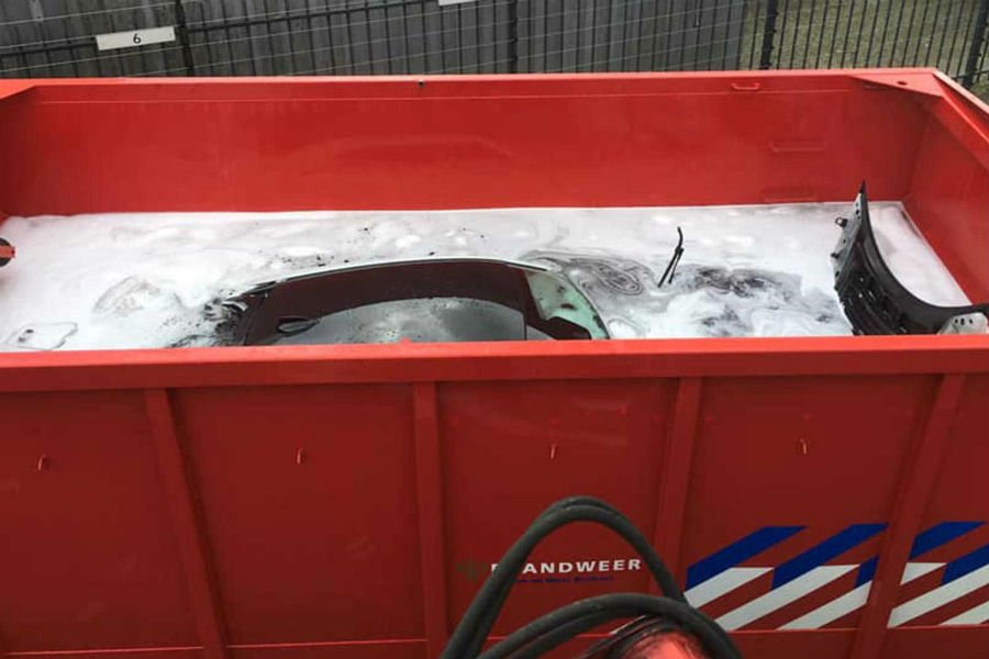 Αν σας προξενεί εντύπωση η μεθοδολογία, θα πρέπει να την αποδώσετε στην φύση των ηλεκτρικών αυτοκινήτων. Η χημική σύσταση των μπαταριών ιόντων-λιθίου είναι τέτοια που απαιτεί συνεχή ρίψη νερού, ώστε να αποτρέπεται η υπερθέρμανση. Δεν είναι, δηλαδή, σαν τα κανονικά αυτοκίνητα όπου βλέπεις την φωτιά, ρίχνεις νερό, την σβήνεις και τέλος. Στα ηλεκτρικά, οι μπαταρίες που έχουν υπερθερμανθεί ή δυσλειτουργούν μπορούν ανά πάσα στιγμή να προκαλέσουν πυρκαγιά, ακόμα κι αν φαινομενικά το αυτοκίνητο φαίνεται σαν να μην κινδυνεύει. Χαρακτηριστικά, η Tesla ενημερώνει πως σε περίπτωση αστοχίας οι μπαταρίες των αυτοκινήτων της απαιτούν την ρίψη τουλάχιστον 11.000 λίτρων νερού ώστε να εξασφαλιστεί ότι δεν θα εκδηλωθεί πυρκαγιά!