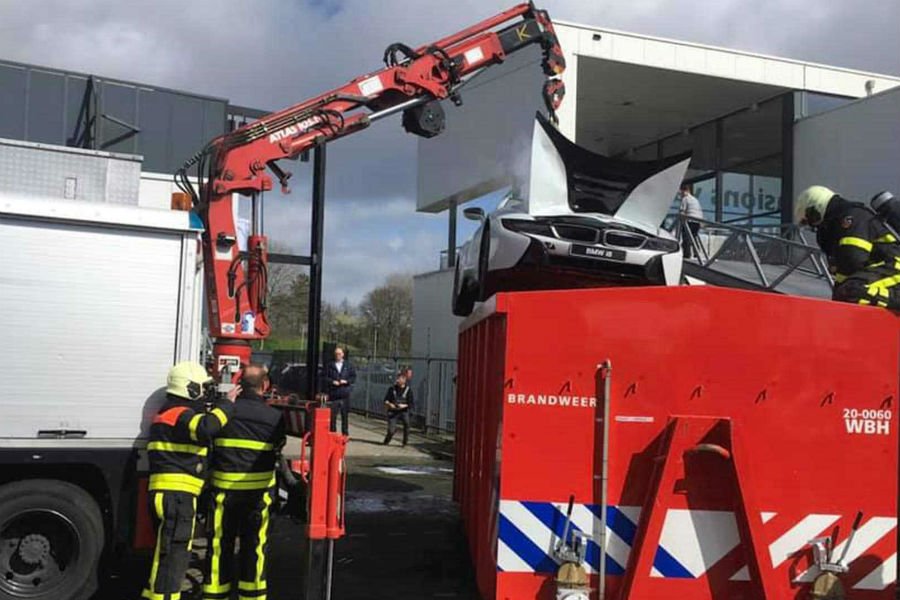 Οι υπεύθυνοι της ολλανδικής αντιπροσωπείας παρατήρησαν καπνούς να βγαίνουν από το i8, καλώντας αμέσως την Πυροσβεστική. Δυο οχήματα (μια αντλία κι ένα γερανοφόρο) κατέφθασαν τάχιστα, όμως αντί να ψεκάσουν με νερό το αυτοκίνητο οι πυροσβέστες γέμισαν με νερό και επιβραδυντικό αφρό ένα κοντέινερ, σήκωσαν το καπνίζον BMW και το βούτηξαν μέσα! Μάλιστα, το άφησαν εκεί για 24 ώρες.
