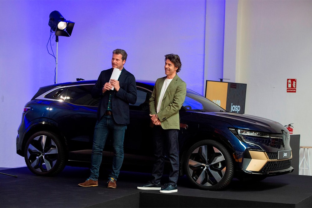 Το Clio ξεχωρίζει ακόμα από τη σκούρα μπλε απόχρωση και τους αντιθετικούς χρυσαφί τροχούς. Το Megane E-Tech από τη μεριά του, διατηρεί τον ίδιο εξωτερικό χρωματισμό και έχει εμπλουτιστεί με μερικά «χρυσά» εξαρτήματα, που εντοπίζονται κυρίως στην εμπρός μάσκα και στα πλευρικά μαρσπιέ. Ναι μεν δεν διαθέτει τους ίδιους τροχούς σε απόχρωση, αλλά η Renault περνάει το μήνυμα.