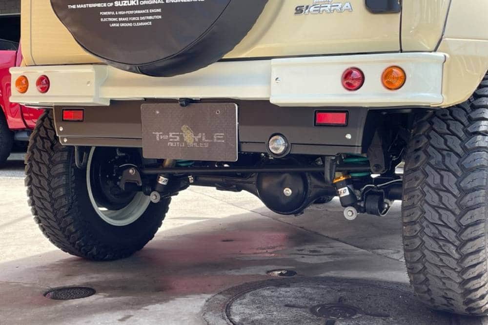 Πάνω σε αυτό βασίζεται το body kit «The Roots (ρίζες)» της Damd, που μετατρέπει το σημερινό Jimny σε νοσταλγική ωδή της δεκαετίας του 70. Το μπεζ χρώμα Chiffon περιλαμβάνει όλο το αμάξωμα, μαζί με τα πλαστικά προστατευτικά, και συνδυάζεται με μια πανέμορφη τετράδα 16άρων ζαντών Crimson Dean, σε χωμάτινα ελαστικά Monster Mad Warrior διάστασης 235/70. Τις εκτός δρόμου δυνατότητες, αλλά και το παρουσιαστικό, του ιαπωνικού «κατσικιού» ενισχύει η αναβαθμισμένη ανάρτηση, που προσφέρει επιπλέον 3,8 εκατοστά απόστασης από το έδαφος (24,8 στο σύνολο).