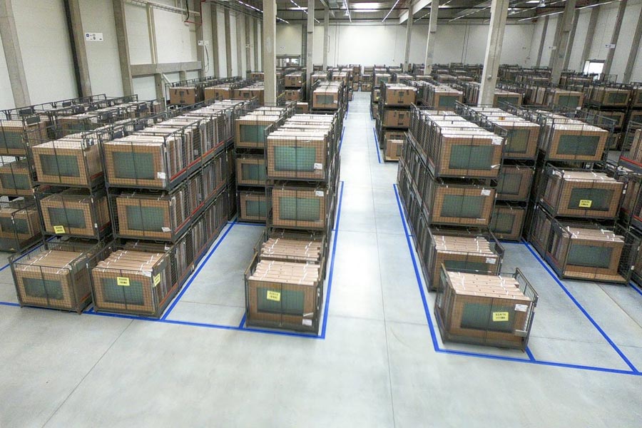 Οι αίθουσες των αποθεμάτων λαμβάνουν καθημερινά παραδόσεις από 1.944 προμηθευτές. Η ημερήσια χωρητικότητα των αποθεμάτων είναι περίπου 200 φορτηγά φορτωμένα με παλέτες γεμάτες υλικό για αποθήκευση. Η αποθήκη χρησιμοποιεί 14 τύπους παλετών οι οποίες είναι ξύλινες αφού προσφέρουν μεγαλύτερη αντοχή από ότι το πλαστικό η το μέταλλο. Κάθε παλέτα που επιστρέφει στο Κέντρο Εξαρτημάτων Skoda και προορίζεται για την αποθήκη, διέρχεται από αυτόματο έλεγχο διαστάσεων και βάρους 3D. Η ανοχή είναι 16 mm και κάθε παλέτα που παρουσιάζει μεγαλύτερη απόκλιση (ως συνέπεια βλάβης, στρέβλωσης κ.λ.π) απορρίπτεται.