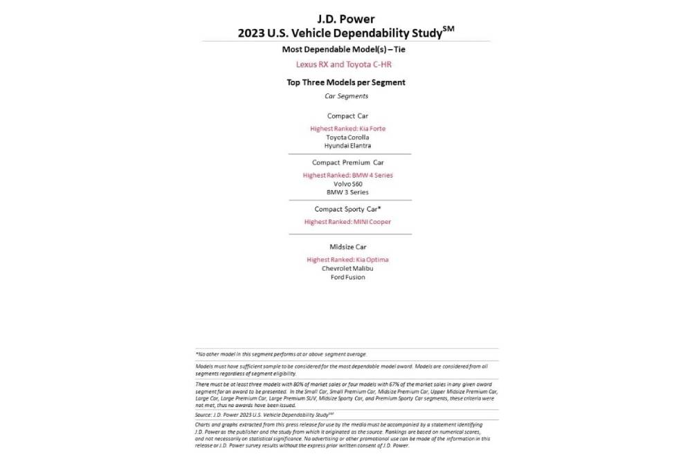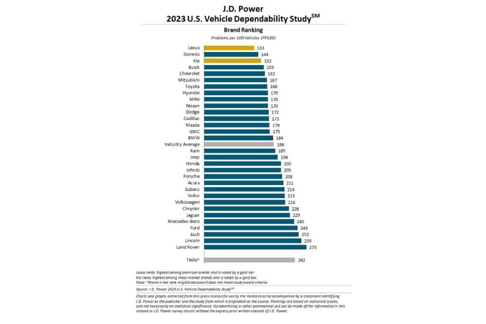 Πρώτος και καλύτερος πάντως, ήρθε ένας premium κατασκευαστής. Η γνωστή και μη εξαιρετέα Lexus πήρε άλλη μια πρωτιά, καταγράφοντας δείκτη μόλις 133 PP100. Δυο στα δυο για τους premium με τη Genesis, η οποία ήρθε δεύτερη και από απόσταση 11 PP100 (144 PP100). Ωστόσο, από εκεί και μέχρι τη 13η θέση -που είναι και η τελευταία πάνω από το μέσο όρο- συναντάμε μόνο mainstream μάρκες. Η Kia κατέλαβε την τρίτη θέση του βάθρου, με 152 PP100, μπροστά από τις Buick (159 PP100) και Chevrolet (162 PP100) για την πρώτη πεντάδα. Mitsubishi, Toyota, Hyundai, MINI και Nissan συμπλήρωσαν το top 10, με τη θυγατρική της BMW να αποτελεί τη μοναδική ευρωπαϊκή παρουσία.