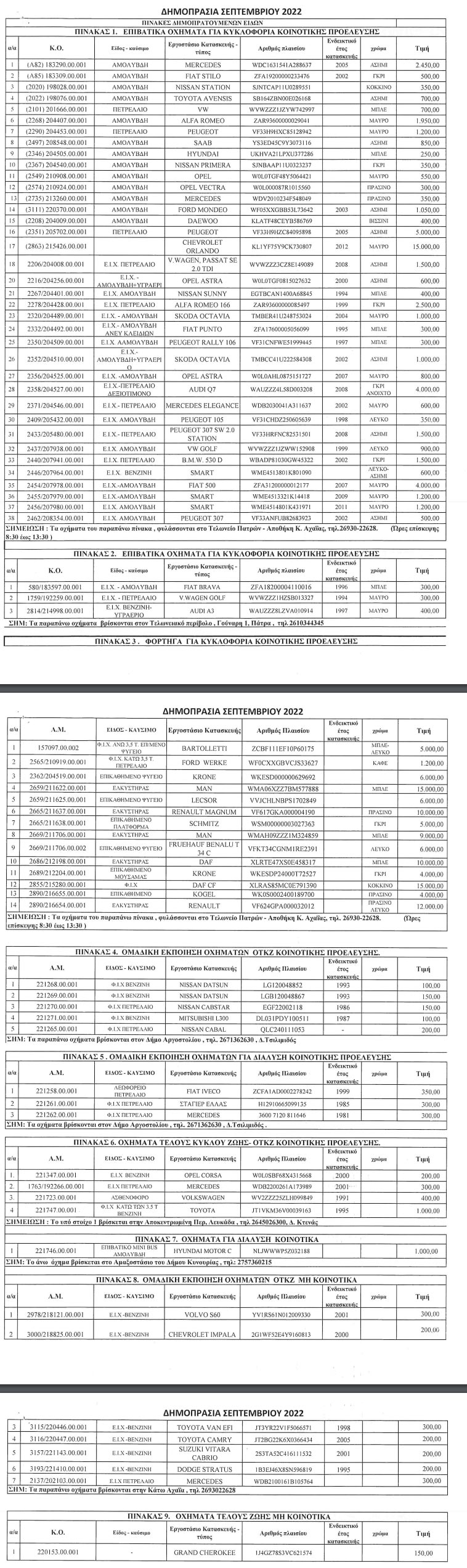 Ακολουθεί παρακάτω αναλυτικά όλος ο πίνακας με τα οχήματα που βγαίνουν σήμερα σε δημοπρασία: