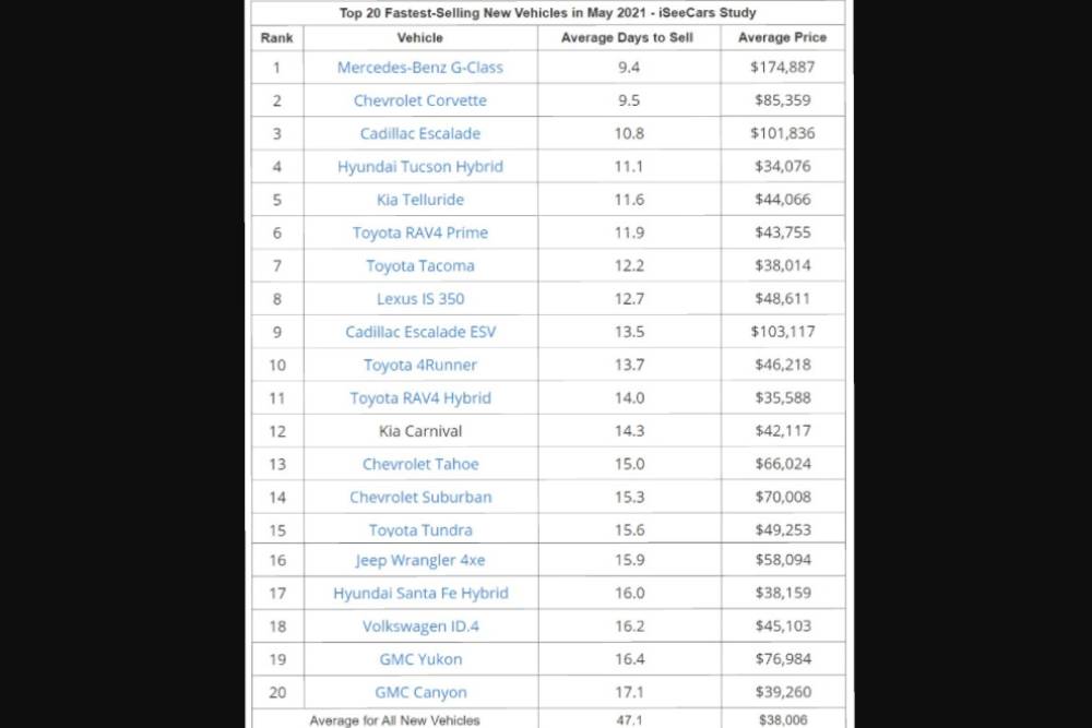 Η μέση τιμή των Corvette που πωλήθηκαν, διαμορφώθηκε στις 85.359 δολάρια. Αυτή της G-Class, πάνω από τα διπλά (174.887 δολάρια)! Τις 100.000 δολάρια υπερέβη και ο μέσος όρος της Escalade, με 101.836. Το πρώτο «φυσιολογικό» μοντέλο ήταν το Hyundai Tucson Hybrid, με μέση τιμή στις 34.076 δολάρια, αλλά και 11,1 μέρες «περίμενε» στη βιτρίνα. Λίγο πίσω το Kia Telluride, με 11,6 ημέρες, ενώ κάθε Toyota RAV4 Prime χρειάστηκε σχεδόν 12 μέρες για να ταξινομηθεί. Το RAV4 Hybrid, δε, ακόμα περισσότερο, με 14 μέρες. Τρεις θέσεις πάνω από την τελευταία του top20 συναντάμε το VW ID.4, με 16,2 μέρες.