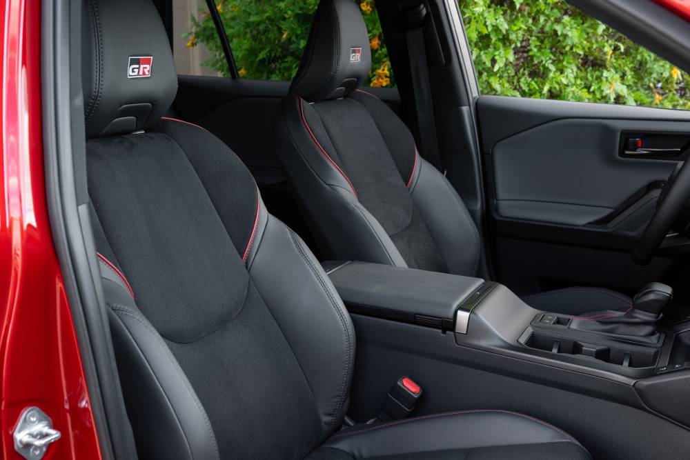 Στο εσωτερικό βρίσκουμε μπάκετ καθίσματα σε συνδυασμό δέρματος-alcantara, λογότυπα «GR» ολούθε και προσοχή στη λεπτομέρεια/αγωνιστική κληρονομιά της Toyota, που περιλαμβάνει μέχρι μαξιλαράκια στην κεντρική κονσόλα στο ύψος των γονάτων οδηγού-συνοδηγού (για να μη χτυπάνε στο WRC, από τις αλλεπάλληλες αλλαγές κατεύθυνσης. Ο νέος ψηφιακός πίνακας οργάνων 12,3 ιντσών είναι στάνταρ, σε συνδυασμό με μια οθόνη infotainment που διατίθεται σε μέγεθος 10,5 ή 12,9 ιντσών, ανάλογα με την έκδοση. Ένα σημαντικό νέο χαρακτηριστικό είναι η εισαγωγή του λογισμικού Arene, το οποίο η Toyota περιγράφει ως το πρώτο βήμα προς «οχήματα πλήρως καθορισμένα από λογισμικό».