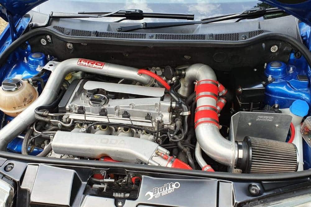 Η Race Blue που βλέπουμε δεν αποκρίνεται σε κανένα από τα παραπάνω, πλην κιβωτίου και σημάτων. Το μηχανοστάσιο πλέον φιλοξενεί τον πασπαρτού 1.8 20VT, με βελτιώσεις που περιλαμβάνουν σφυρήλατα έμβολα, ενισχυμένες μπιέλες, μεγαλύτερο τούρμπο, ολόσωμη εξάτμιση και νέο εγκέφαλο. Κλασικά πράγματα για τον διαχρονικό 1.800άρη τούρμπο του VW Group (πάλαι ποτέ VAG), που εκτινάσσουν την απόδοση στα 372 άλογα στις 6.200 σ.α.λ.! Αναβαθμίσεις συναντάμε παντού, με τα φρένα να αποτελούνται από τρυπητές δισκόπλακες και πολυπίστονες δαγκάνες (6 εμβόλων μπροστά, 4 πίσω), την ανάρτηση από ολοκληρωμένο και πλήρως ρυθμιζόμενο, coilover kit, νέα ημιαξόνια, μπλοκέ διαφορικό της Quaife και συμπλέκτη της Sachs, ενώ στο εσωτερικό δεσπόζουν δυο ανθρακονημάτινα μπάκετ.