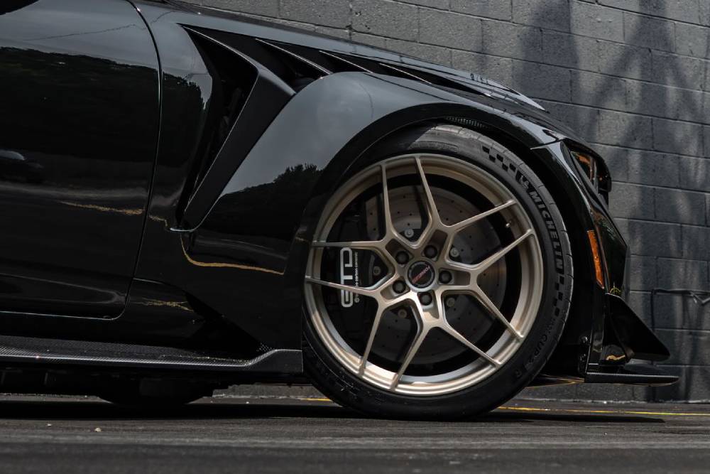 Η αμερικανική Forgeline επέλεξε μια κατάμαυρη Mustang GTD για να διαφημίσει τα νέα της «πατούμενα», ονόματι VV1R. Το ανοιχτό χρυσαφί φινίρισμα (Satin Performance Gold) δένει εκπληκτικά με το σκοτεινό παρουσιαστικό, ενώ το σχέδιο (πεντάκτινες δίμπρατσες) των 20άρηδων τροχών από τη μία είναι κοντά σε εκείνο των εργοστασιακών, από την άλλη διαφοροποιείται όσο ακριβώς πρέπει. Τα ειδικά εξελιγμένα ελαστικά Michelin Pilot Sport Cup 2R, εννοείται δεν πάνε πουθενά. Την υψηλότερη ισχύ σε ‘Stang παραγωγής όλων των εποχών καλούνται να διαχειριστούν, εξάλλου.