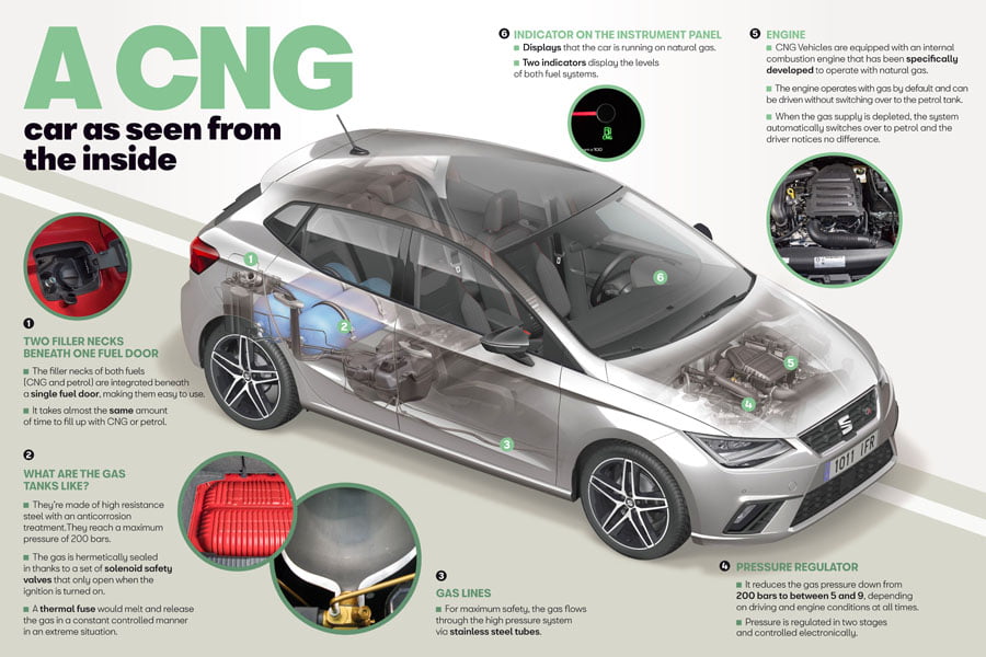 Δύο τύποι καυσίμων και ένας μόνο κινητήρας: Τα αυτοκίνητα CNG είναι εξοπλισμένα με τελευταίας τεχνολογίας κινητήρα εσωτερικής καύσης, που λειτουργεί με συμπιεσμένο φυσικό αέριο ή βενζίνη. Ο οδηγός δεν αντιλαμβάνεται πότε πραγματοποιείται η αλλαγή αυτή, καθώς η απόδοση του κινητήρα είναι ακριβώς η ίδια και με τους δύο τύπους καυσίμου.