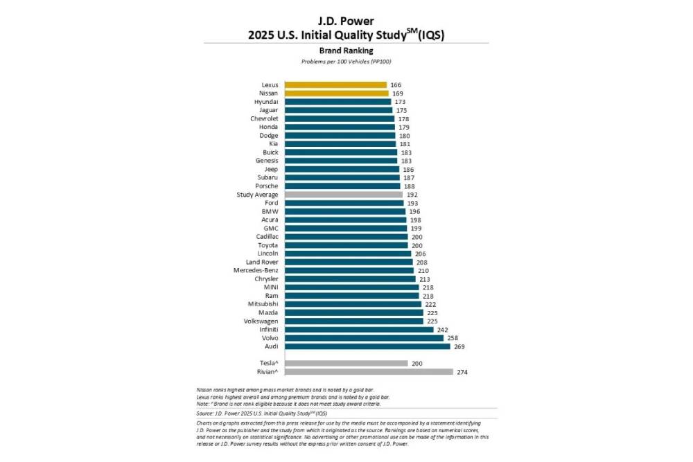 Στα της κατάταξης τώρα, πρώτος και καλύτερος ήρθε ένας premium κατασκευαστής. Η γνωστή και μη εξαιρετέα Lexus πήρε άλλη μια πρωτιά, καταγράφοντας δείκτη 166 PP100 και ξεπερνώντας με άνεση το μέσο όρο των 192 PP100. Από πολύ κοντά της η Nissan, που πήρε και την πρωτιά στις μη premium εταιρίες, με 169 PP100. Τρίτη ήρθε η Hyundai, με 173 PP100, και τέταρτη η τεράστια έκπληξη της φετινής έρευνας: η φημισμένη για τα προβλήματα αξιοπιστίας, Jaguar (175 PP100). Η Chevrolet έκλεισε το top 5, με 178 PP100, την ώρα που Honda-Subaru και Kia-Genesis ολοκλήρωσαν την κυριαρχική παρουσία των Ασιατών στο top 10. Μια πρώτη δεκάδα, όπου με το ζόρι βρίσκουμε δυο ευρωπαϊκές αυτοκινητοβιομηχανίες: την προαναφερθείσα Jaguar (που τελεί υπό την ιδιοκτησία Ινδών) και την Porsche, η οποία μετά βίας κατάφερε να περάσει τη βάση (188 PP100).