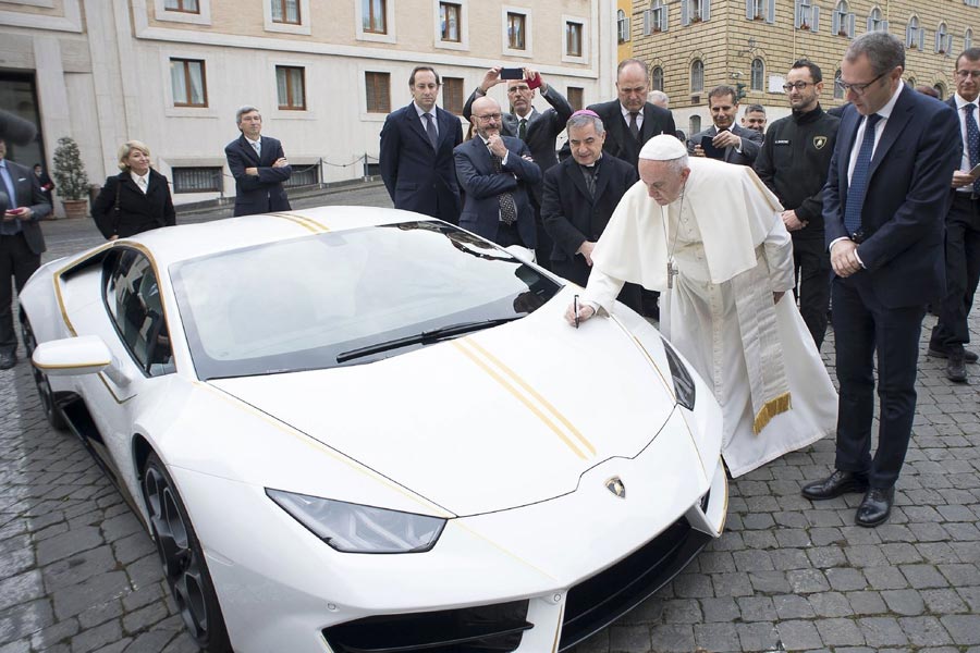 Η συγκεκριμένη Lamborghini Huracan είναι μοναδική, καθώς είναι βαμμένη σε λευκό χρώμα με χρυσές λεπτομέρειες και ρίγες (τα χρώματα της σημαίας του Βατικανού) και έχει την υπογραφή και την… ευλογία του Πάπα. Φυσικά το supercar το οποίο δόθηκε στον Πάπα Φραγκίσκο ως δώρο πέρυσι δεν έχει κυκλοφορήσει ποτέ και ήταν αποθηκευμένο κατάλληλα (εκτός αν το έπαιρνε κρυφά το βράδυ ο Πάπας και έκανε κόντρες…).