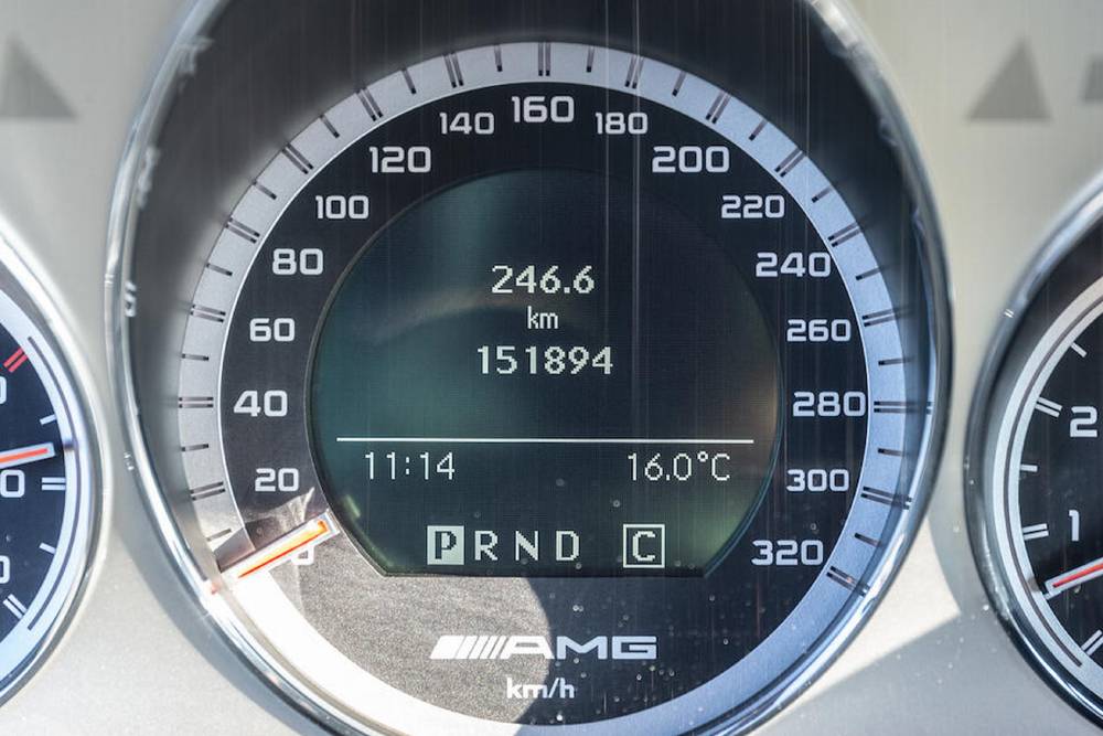 Παρά τις συχνές αλλαγές σπιτικών, η ένδειξη του οδόμετρου παραμένει στη λογική ένδειξη των 151.894 χλμ. – λιγότερο από 15.000 χλμ. ετησίως. Η καλή τύχη της εν λόγω C63 την έφερνε συνεχώς σε κατόχους που τηρούσαν ευλαβικά τα διαστήματα συντήρησης, οπότε ούτε η εξαιρετική κατάσταση στην οποία έχει διατηρηθεί προκαλεί έκπληξη. Κάτω από το καπό βρυχάται ο ατμοσφαιρικός V8 των 6.207 κ.εκ., με απόδοση 457 ίππους στις 6.800 σ.α.λ. και 600 Nm στις 5.000 σ.α.λ. Η συνεργασία του με το 7άρι αυτόματο G-TRONIC έχει σαν αποτέλεσμα 4,5 δλ. για το 0-100 χλμ./ώρα, με την τελική να περιορίζεται ηλεκτρονικά στα 250 χλμ./ώρα.