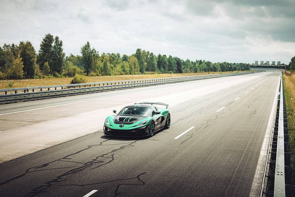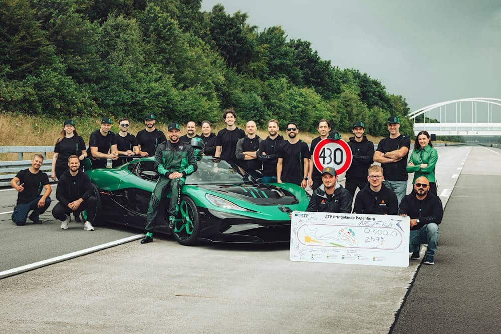 Το Nevera R έστησε πάρτι στις ευθείες των 4 χιλιομέτρων της πίστας Automotive Testing Papenburg στη Γερμανία, παρουσία εκπροσώπων από τις Racelogic και Dewesoft για την πιστοποίηση των μετρήσεων. Η πιο σκληροπυρηνική παραλλαγή του Nevera πάτησε τέρμα γκάζι σε απολύτως «μαμά» μορφή, καθώς η μόνη αλλαγή που είχε το ιστορικό Nevera από τα υπόλοιπα παραγωγής, εντοπίζεται στην αφαίρεση του ηλεκτρονικού περιοριστή των 410 χλμ./ώρα. Τα ειδικά εξελιγμένα ελαστικά Michelin Sport Cup 2 διατίθενται στο στάνταρ εξοπλισμό, συνεπώς το αυτοκίνητο ήταν πέρα για πέρα σύννομο με τις εργοστασιακές προδιαγραφές.