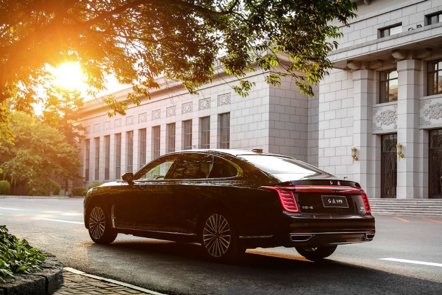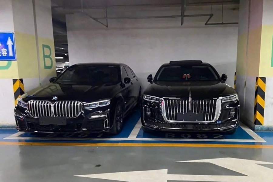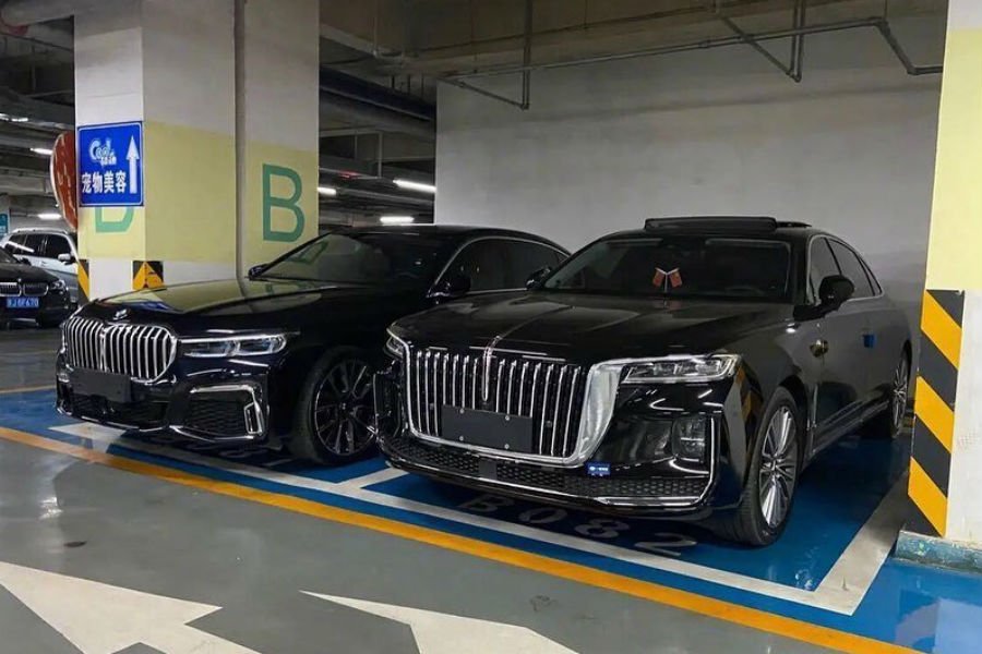 Το αυτοκίνητο που βλέπουμε δίπλα στην 7αρα, είναι το Hongqi H9. Μια κινεζική λιμουζίνα στην κατηγορία των Σειρά 7 και Mercedes S-Class, αλλά στο πολύ πιο προσιτό. Οι σχεδιαστές του βέβαια κοίταξαν ακόμα πιο ψηλά για να αντλήσουν έμπνευση, με το εμπρός μέρος να θυμίζει ελαφρά αυτό της Rolls-Royce Ghost. Η τεράστια μάσκα ομολογουμένως δένει αρκετά αρμονικά με τα δυο μικρά φωτιστικά σώματα, ενώ μπορούμε να πούμε πως είναι πιο εντυπωσιακή από αυτό της BMW, έχοντας LED ημέρας στο περίγραμμα να ενώνεται με τους προβολείς. Ακόμα ένα LED, κόκκινου χρώματος, «δείχνει» το σήμα στο καπό