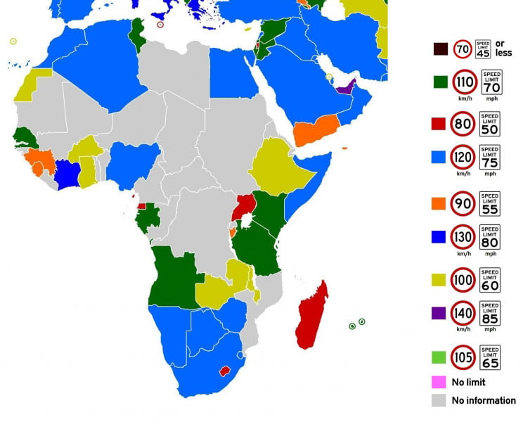 Στην Αφρική είναι άγνωστα τα όρια ταχύτητας σε πολλά κράτη. Ωστόσο, στην Αίγυπτο, Αλγερία, Νιγηρία, Νότια Αφρική, Ναμίμπια κ.λπ. (με ανοιχτό μπλε χρώμα), το όριο είναι 120 χλμ./ώρα. Στα 80 χλμ./ώρα περιορίζονται οι οδηγοί στη Μαδαγασκάρη.
