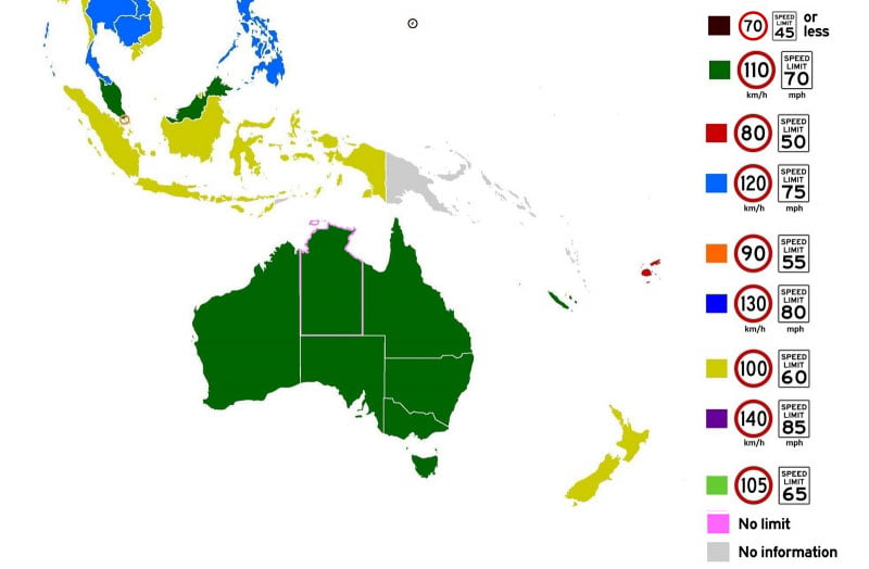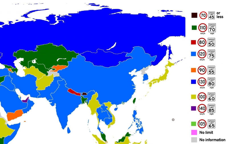 Οι οδηγοί στην Ασία επιτρέπεται να φτάσουν τα 120 ή 130 χλμ./ώρα. Στα Ηνωμένα Αραβικά Εμιράτα η νόμιμη ταχύτητα ανεβαίνει στα 140 χλμ./ώρα, ενώ στο άλλο άκρο η Ιαπωνία έχει όριο μόλις 100 χλμ./ώρα. Λίγο πιο γρήγορα μπορούν να κινηθούν οι οδηγοί στην Αυστραλία, μέχρι τα 110 χλμ./ώρα.