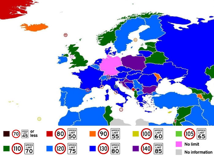 Στις περισσότερες χώρες της Ευρώπης ισχύει το όριο των 130 χλμ./ώρα, όμως στην Πολωνία, Κροατία και Βουλγαρία ισχύουν τα 140 χλμ./ώρα. Στην Ισπανία, Πορτογαλία και Ελβετία επιτρέπεται μέχρι 120 χλμ./ώρα, ενώ στην Αγγλία είναι μόνο 110 χλμ./ώρα.