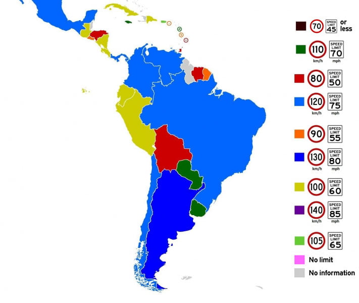Στη Νότια Αμερική τα όρια κυμαίνονται από 120 έως 130 χλμ./ώρα. Για παράδειγμα στη Βραζιλία μπορεί κανείς να τρέξει μέχρι 120 χλμ./ώρα και στην Αργεντινή μέχρι 130 χλμ./ώρα.