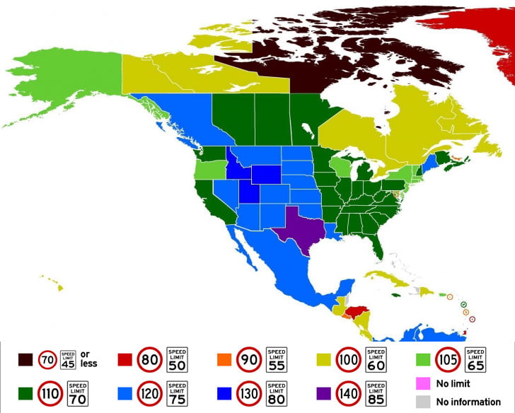 Στη Βόρεια Αμερική η μέγιστη επιτρεπόμενη ταχύτητα κυμαίνεται μεταξύ 110 έως 120 χλμ./ώρα. Πιο γρήγορα μπορούν να τρέξουν οι οδηγοί στο Τέξας και να φτάνουν νόμιμα μέχρι τα 140 χλμ./ώρα.