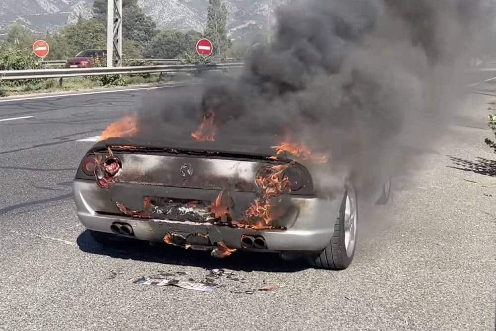 Ενόσω υποψήφιος αγοραστής και πωλητής έκαναν ανέμελοι το test drive τους, η ασημί F355 GTB άρχισε να εκδηλώνει τη δυσαρέσκειά της με καπνούς. Όπου υπάρχουν, γνωρίζουμε πως εμφιλοχωρεί και πυρκαγιά. Η F355 είναι σεσημασμένη για το συγκεκριμένο πρόβλημα, έχοντας ανακληθεί 4 φορές από το Μαρανέλο. Ούτως ή άλλως, οι αυταναφλέξεις Ferrari δεν είναι κάτι πρωτόγνωρο. Ο Salah υποστηρίζει πως σύμφωνα με το βιβλίο σέρβις, είχαν αντικατασταθεί όλα τα εξαρτήματα (κύκλωμα τροφοδοσίας) που περιλαμβάνονταν στα προγράμματα ανάκλησης. Παρόλα αυτά, η φωτιά ξεκίνησε από το μηχανοστάσιο (πιθανόν από διαρροή υγρού της υδραυλικής υποβοήθησης – άλλο μεγάλο πρόβλημα των F355).
