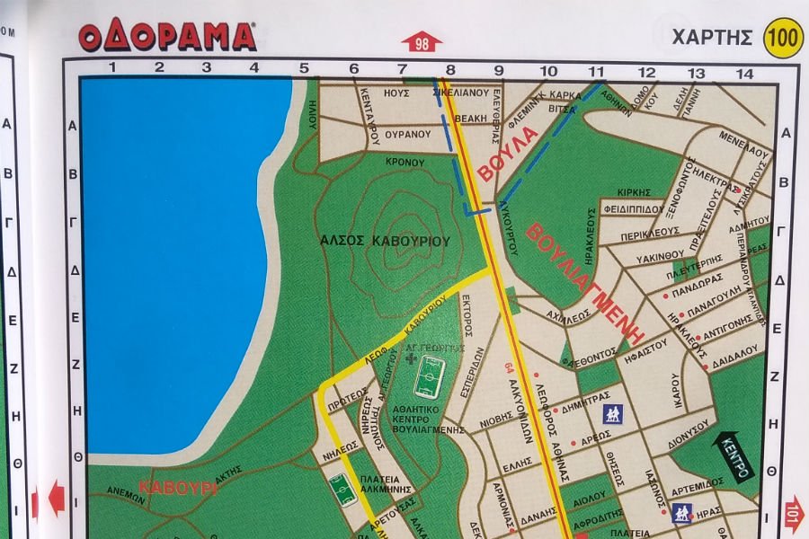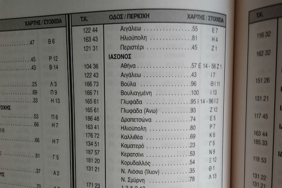 Τότε, λοιπόν, αν ήθελες να πας στη Βουλιαγμένη, στην Οδό Ιάσονος ας πούμε, ακολουθούσες την εξής διαδικασία: έψαχνες αλφαβητικά το δρόμο στα περιεχόμενα. Έβρισκες την περιοχή (Ιάσονος τότε υπήρχε σε 17 ακόμα πόλεις, πέραν της Βουλιαγμένης), που δίπλα της είχε κάποια στοιχεία. Εν προκειμένω «100» και «Ι 13». Το πρώτο νούμερο, αντιστοιχούσε στον χάρτη (ή σελίδα, αν προτιμάτε). Ο κωδικός Ι 13 έδινε τρόπον τινά το γεωγραφικό στίγμα του δρόμου. Κάτι σαν συντεταγμένες μήκους και πλάτους, δηλαδή.