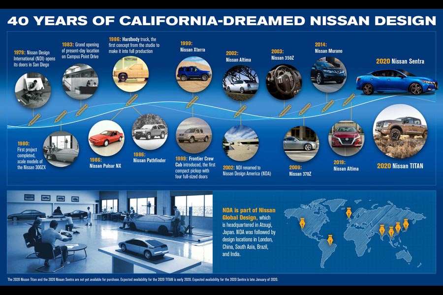 Με την ονομασία Nissan Design America (NDA), το σχεδιαστικό κέντρο με έδρα την Καλιφόρνια, ηγήθηκε επίσης στο σχεδιασμό του Τitan 2020, αλλά και του ολοκαίνουργιου Sentra 2020. Το NDA συμβάλει δημιουργικά στον τομέα του σχεδιασμού της Nissan, σε παγκόσμιο επίπεδο. Κατά τη διάρκεια των τεσσάρων τελευταίων δεκαετιών, το NDA συνέβαλε στο σχεδιασμό περίπου 20 πρωτότυπων μοντέλων και 30 μοντέλων παραγωγής. Για τον εορτασμό της επετείου, η Nissan τονίζει μερικά από τα πιο αξιοσημείωτα οχήματα παραγωγής του NDA: