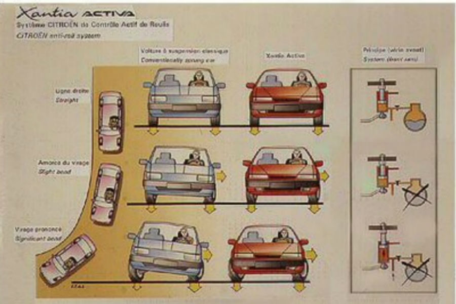 Αναλόγως καμπής, γέμιζαν υγρό ανά δύο προκειμένου να αντισταθμίσουν τις πλευρικές δυνάμεις – και πάντα σε συνέργεια με την ανάλογη κίνηση από τις φούσκες τις ανάρτησης. Με λίγα λόγια, η ανάρτηση ανύψωνε το αυτοκίνητο από την εξωτερική μεριά και το χαμήλωνε από την εσωτερική (για παράδειγμα, σε αριστερή στροφή σήκωνε αριστερά και χαμήλωνε δεξιά). Κατ’ αυτό τον τρόπο, η Xantia Activa πέρναγε κυριολεκτικά «τραπέζι» από τις στροφές! Η σύγκριση μεταξύ των δυο ειδών υδροπνευματικής ανάρτησης στο ίδιο σημείο και με τα ίδια χιλιόμετρα, είναι πραγματικά αποκαλυπτική. Εδώ η Xantia με Hydractive