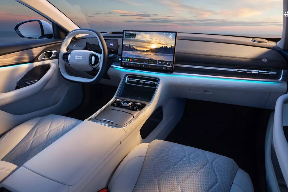 Στο εσωτερικό τώρα, βρίσκουμε τη γνώριμη, «διαστημική», εικόνα που απαντάται σχεδόν σε κάθε νέο κινεζικό μοντέλο. Μια τεράστια οθόνη αφής σε κέντρο-κορυφή ταμπλό, ένας ψηφιακός πίνακας οργάνων (μακρόστενος εδώ) μπροστά από τον οδηγό, ευθείες και μακρόσυρτες γραμμές στους αεραγωγούς του κλιματισμού, κορυφαία υλικά, φαρδιά κεντρική κονσόλα και flat bottomed τιμόνι πάνω-κάτω.