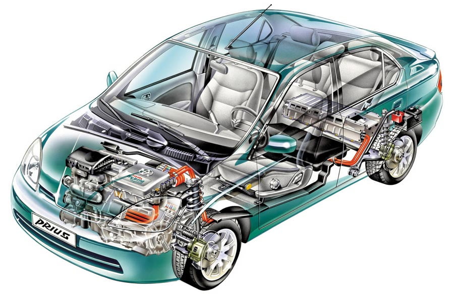 Το πρώτης γενιάς Prius (μήκους 4.275 χλστ.) με το Toyota Hybrid System (THS) διέθετε κινητήρα βενζίνης 1.5 λτ. κύκλου Atkinson ισχύος 58 ίππων και 102 Nm ροπής, ένα ηλεκτροκινητήρα 40 ίππων και 305 Nm ροπής και μια μπαταρία νικελίου μετάλλου υβριδίου. Το 2000 το υβριδικό σύστημα αναβαθμίστηκε και ο κινητήρας βενζίνης απέδιδε 72 ίππους και 111 Nm ροπής και ο ηλεκτροκινητήρας έφτανε τους 44 ίππους και 350 Nm ροπής. Το Prius του 2000 επιτάχυνε στο 0-100 χλμ./ώρα σε 13,5 δλ., έφτανε τα 160 χλμ./ώρα τελικής και κατανάλωνε 5,1 λτ./100 χλμ.