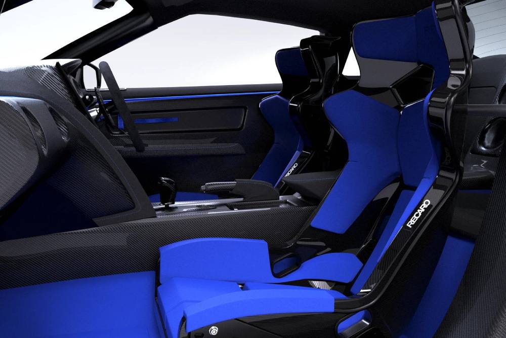 Οι αλλαγές στο εσωτερικό δεν έχουν σχέση με ρετρό διαθέσεις, καθώς στο ταμπλό αναλαμβάνει πλέον μια τεράστια οθόνη «α λα Tesla». To τιμόνι είναι aftermarket δίχως αερόσακο, ενώ οι περισσότερες επιφάνειες καλύπτονται από ανθρακονήματα. Εξυπακούεται ότι η alcantara δεν λείπει, ούτε τα μπάκετ αγωνιστικών προδιαγραφών.