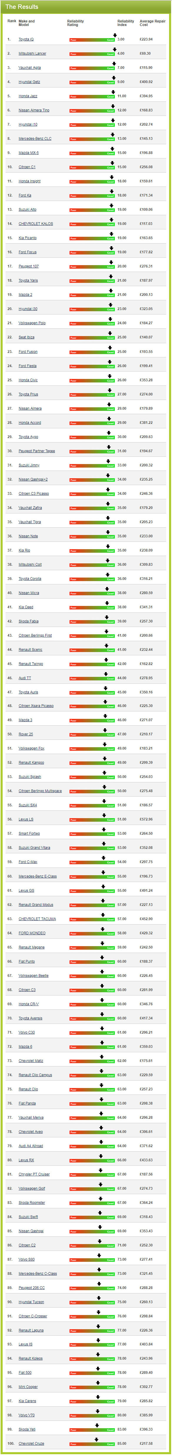 Από τις πιο μεγάλες έρευνες αξιοπιστίας αυτοκινήτων που γίνονται σε ευρωπαϊκή χώρα, είναι αυτή της Βρετανικής Reability Index, της οποίας τα δεδομένα ενημερώνονται συνεχώς μέσω της εταιρείας επέκτασης εγγύησης Warranty Direct (πάνω από 50.000 δεδομένα). Ο δείκτης αξιοπιστίας ενημερώνεται συνεχώς και υπολογίζεται από τον συνδυασμό του αριθμού βλαβών του αυτοκινήτου, του κόστους επισκευής, του μέσου χρόνου που μένει σε ακινησία λόγω επισκευών, της ηλικίας του οχήματος και των διανυθέντων χιλιομέτρων.