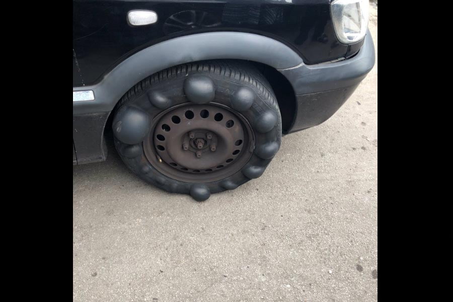 Το εικονιζόμενο όμως λάστιχο, θα πρέπει να γραφτεί στο βιβλίο Γκίνες, ως το ελαστικό με τα περισσότερα καρούμπαλα στον κόσμο! Πραγματικά το θέαμα είναι απίστευτο και εντοπίστηκε σε ένα Opel (Vauxhall μάλλον) Zafira πρώτης γενιάς, από έναν αστυνομικό του Ντέρμπι.