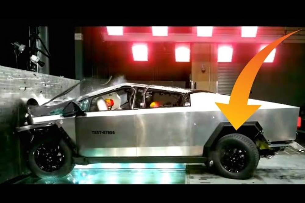 Για να αντιληφθούμε καλύτερα τη ζωτική σημασία των ζωνών παραμόρφωσης, ας δούμε τα σύντομα πλάνα από τα crash tests που δημοσίευσε η Tesla. Η πρώτη δοκιμή αφορά μετωπική πρόσκρουση σε σταθερό εμπόδιο, με 56,3 χλμ./ώρα (35 μίλια/ώρα). Η δεύτερη πλευρική σύγκρουση άλλου οχήματος πάνω στο Cybertruck, με 61,1 χλμ./ώρα (38 μίλια/ώρα).