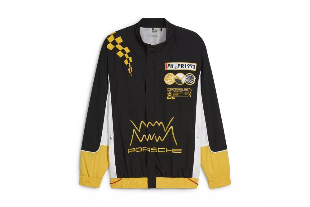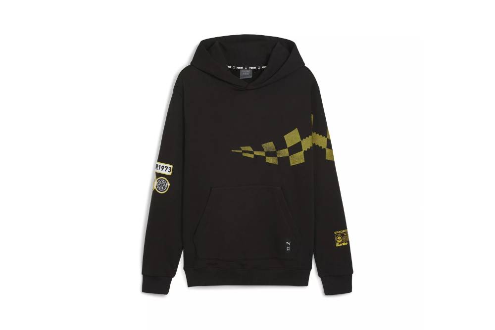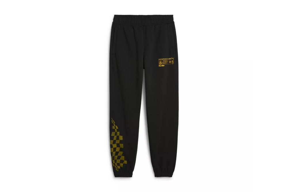 Ίδια χρωματική επιλογή και την υπόλοιπη σειρά προϊόντων, που περιλαμβάνουν ζακέτες, φόρμες, T-shirt και φούτερ. Σε αυτά, ωστόσο, η σχέση με την εικονιζόμενη 911 Turbo εμφανίζεται μεγαλύτερη, καθώς οι ενδιαφερόμενοι μπορούν να επιλέξουν έναν πολύ ωραίο συνδυασμό φούτερ-παντελονιού σε μαύρο-χρυσαφί (ξεθωριασμένο κίτρινο, για την ακρίβεια, που φέρνει σε χρυσαφί), με καρό σημαία χαμηλά στα πόδια. Και εδώ δεν απουσιάζουν τα λογότυπα της γερμανικής εταιρίας, τα οποία σε κάποιες περιπτώσεις (το μπουφάν, ας πούμε) είναι αρκετά κραυγαλέα.