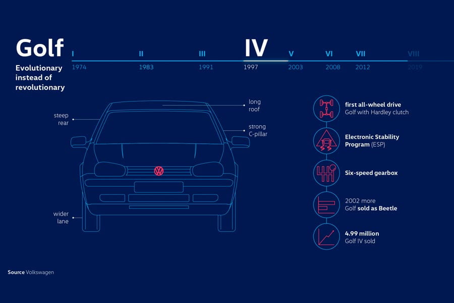 Το τέταρτης γενιάς VW Golf το οποίο παρουσιάστηκε το 1997 θεωρείται ένα από τα design icons στην αυτοκινητοβιομηχανία μεταξύ των ειδικών. Αυτό οφείλεται στο γεγονός ότι γεφυρώνει το χάσμα με το Golf Mk1 του 1974, με όλα τα ξεκάθαρα χαρακτηριστικά του και τον παραδοσιακό σχεδιασμό της κολόνας C.