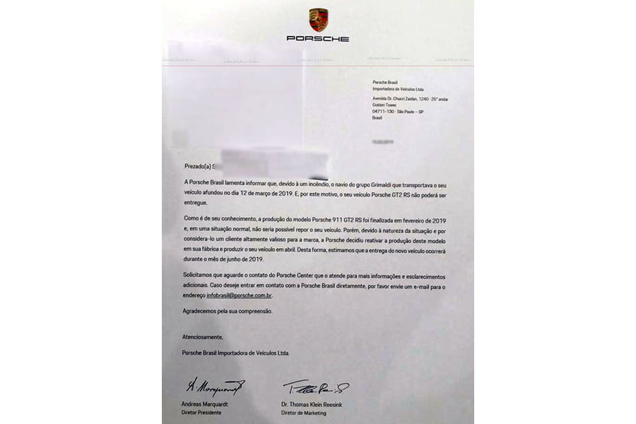 Σε ότι αφορά την έξτρα παραγωγή των Porsche 911 GT2 RS, η γερμανική φίρμα μπορεί να μην έχει επιβεβαιώσει επίσημα το γεγονός, ωστόσο επιστολή που ήρθε στη δημοσιότητα, αποδεικνύει ότι η Porsche ζητάει από τον πελάτη της συγνώμη για μη παράδοση του αυτοκινήτου λόγω του ναυαγίου, τονίζοντας ότι η παραγωγή της 991 GT2 RS έχει σταματήσει από τον Φεβρουάριο.