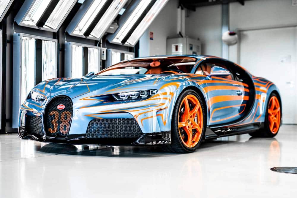 Η βαφή Vagues de Lumière είναι ειδικά σχεδιασμένη από το τμήμα customization της γαλλογερμανικής εταιρίας, ενώ οι χειροποίητες πορτοκαλί ενθέσεις αναπαριστούν τον τρόπο που αντανακλά το φως στις επιφάνειες του αμαξώματος. Οι σχεδιαστές της Bugatti αποφάσισαν να βάψουν και τις ζάντες στο ίδιο χρώμα, προσθέτοντας παράλληλα τον αριθμό «38» στη μάσκα (δεν διευκρινίζεται τί σημαίνει). Σίγουρα, πάντως, δεν αφορά τον αριθμό παραγωγής, καθώς μόνο 9 Chiron Super Sport θα κατασκευαστούν. Συγκριτικά, είναι πιο σπάνια ακόμα κι από την Super Sport 300+ (30 κομμάτια).